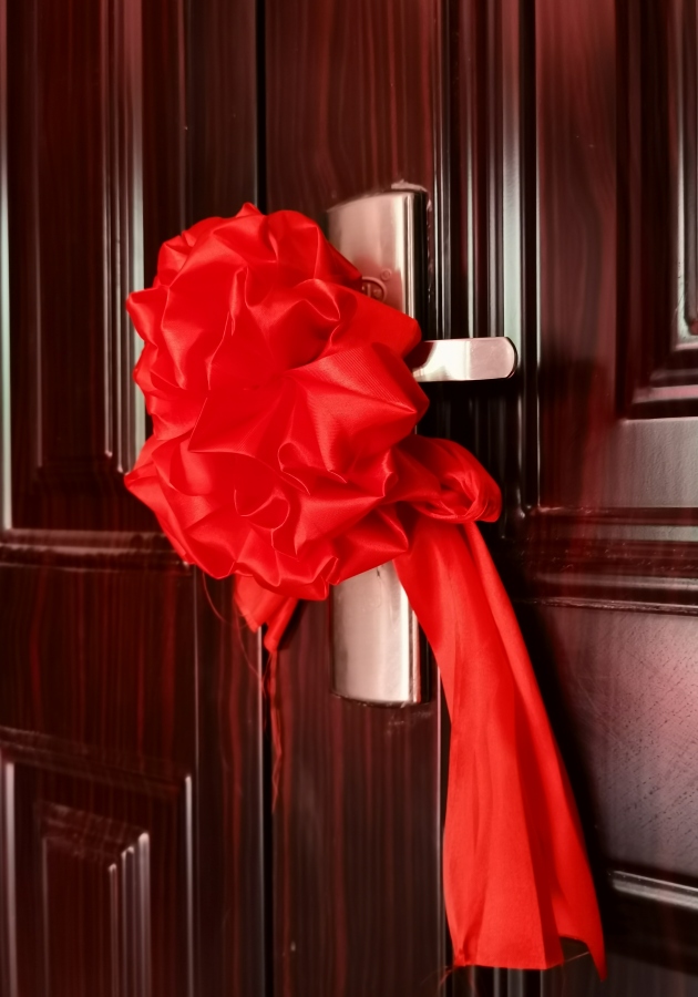 入戶門上系上了紅綢花,